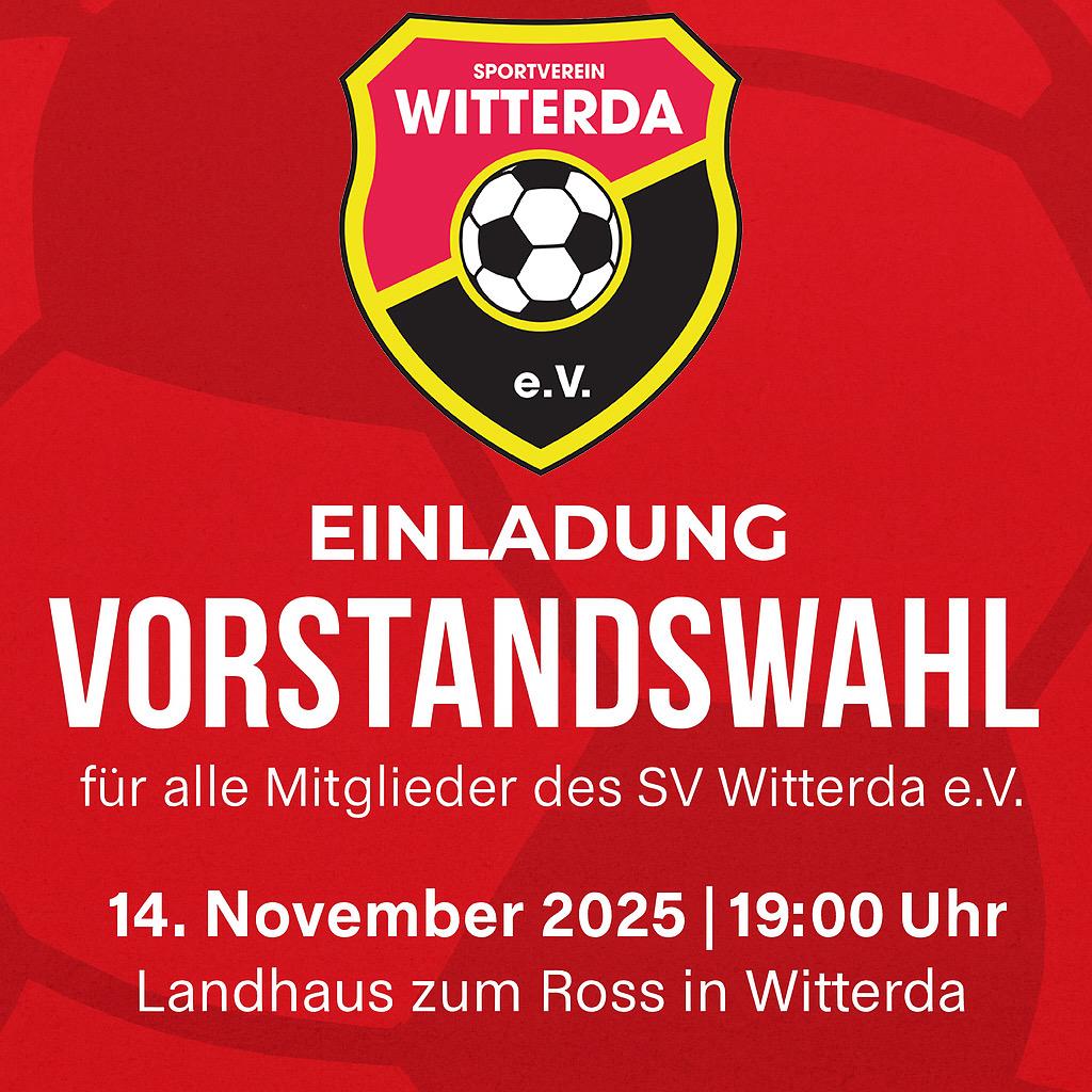 Interessierte Mitglieder, die sich für eine Mitarbeit im Vorstand des SV Witterda e.V. bewerben möchten, werden gebeten, ihre Bereitschaft bis zum 31. Oktober 2025 schriftlich beim Vorsitzenden des Vereins, Herrn Steffen Tschiche (Vor dem Haun 15, 99189 Witterda), einzureichen.